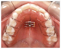 拡大床装置歯列の横幅を広げたり、数歯の移動を目的とした装置です。中央のネジを調整し、装置の幅をゆっくりと広げ、顎の骨を押し広げていきます。
