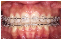 マルチブラケット装置(表側 ホワイトワイヤー使用)表側に透明な装置と白色のワイヤーを用います。やや目立ちにくい治療を行うことができます。