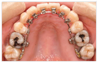 マルチブラケット装置(部分)前歯4本を揃えたり、永久歯の生えている部分を先に並べる時に使用します。