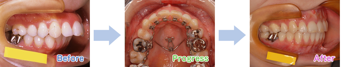 診断名:上顎右側側切歯先天性欠如、および下顎右側第一大臼歯欠損を伴う反対咬合